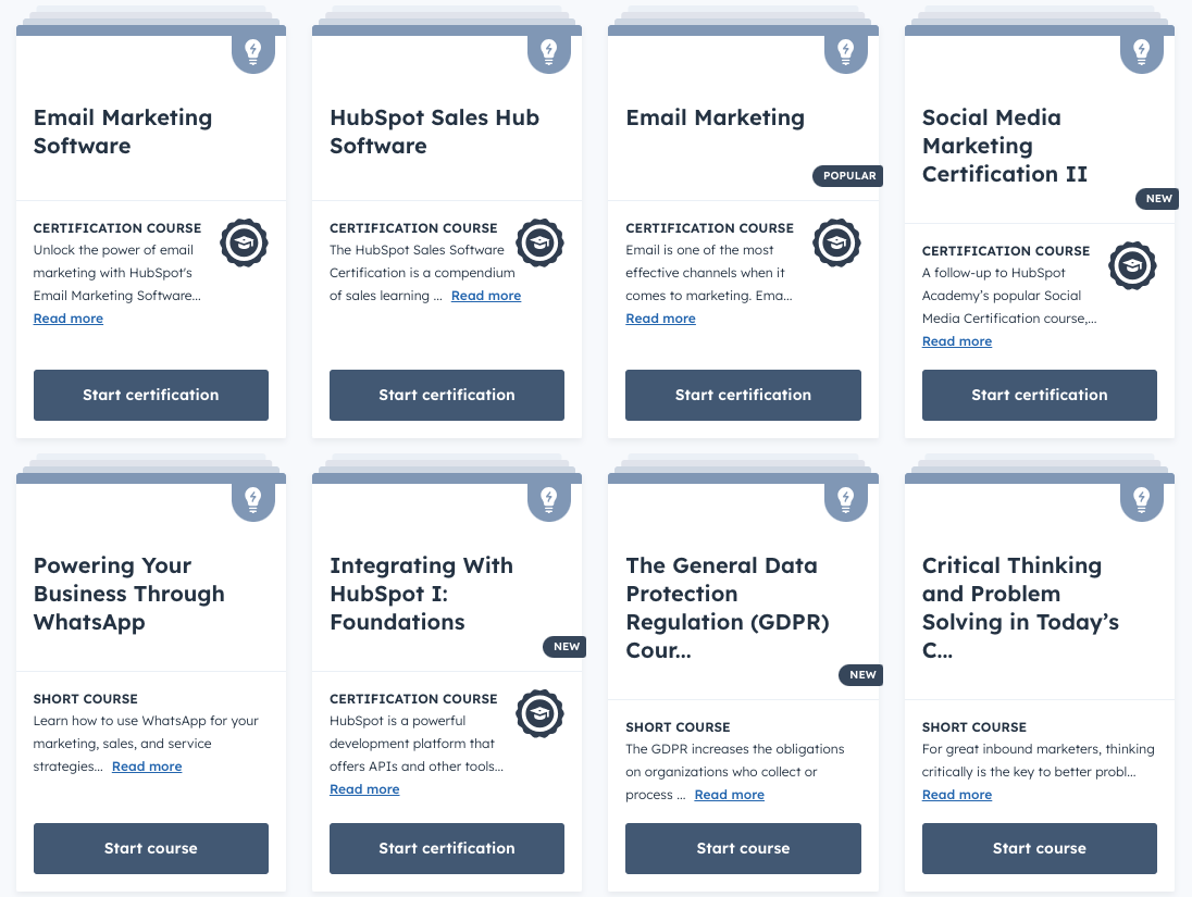 HubSpot’s strategy focuses on high-value content like blogs, eBooks, webinars, and templates. They also provide free courses and certifications through HubSpot Academy. This education platform offers in-depth training on inbound marketing, CRM, and marketing automation.